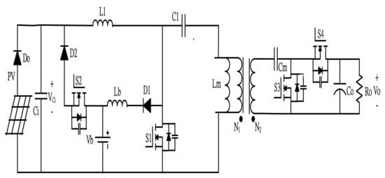 This paper proposes a novel three-port high-step-up/step-down bidirectional DC/DC converter with a coupled inductor, as shown in Figure 3. The DC-blocking capacitor Cm at the high-voltage side enables the system to operate in the high-step-down mode by reducing the voltage on the transformer. Moreover, synchronous rectification is performed in the switch during the high-step-up mode to reduce switch loss to increase the system’s overall efficiency. Moreover, the energy stored in the leakage inductor on the transformer’s secondary side can be recycled, which increases the system efficiency. An improved SEPIC is used on the low-voltage side of the PV modules to step-up the output of the PV modules for battery charging and provide energy to the DC bus. The auxiliary inductor Lb,L1 at the battery side can modify the output step-up voltage after it is modified and provide continuous current for charging the battery. Switch S2 and diode D2 prevent the energy generated from the PV system from charging the battery directly and controlling the step-up process for providing energy to the DC bus and charging the battery when the energy supplied from the PV modules is sufficient. The battery output is stepped-up and provides energy to the DC bus in case of a lack of energy supply from the PV modules. If excess energy is present in the DC bus, the energy is used to charge the battery.