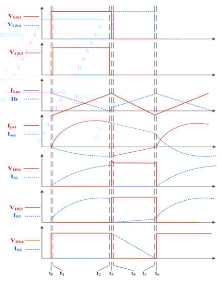 When the energy supplied from the PV modules is insufficient, the system steps-down the output voltage of the DC bus for battery charging. The key waveforms of the proposed converter topology in the step-down stage are shown in Figure 8.
