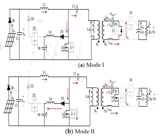 When t = t1, S1 and D1 remain ON, while S2, S4, and D2 remain OFF. In this mode, S3 is turned ON for operating synchronous rectification, and the direction of the current flow is as shown in Figure 5b. Other operations are the same as those in Mode I. Energy is stored in L1 and Lm by the PV source, Lb releases energy for battery charging, Cm is charged by the induced current from the transformer, and Co continues to provide energy to the output Vo.