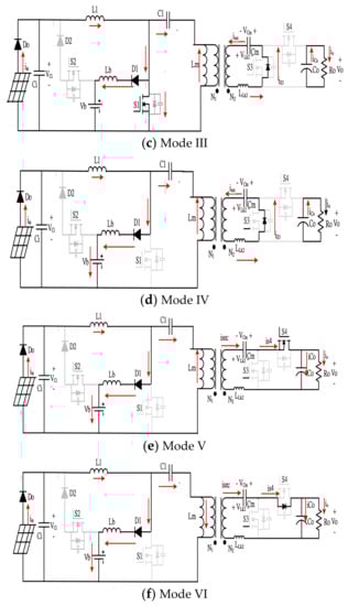As shown in Figure 5a, when t = t0, switch S1 and diode D1 turn ON, while switches S2, S4, and diode D2 turn OFF. Furthermore, the parasitic diode of switch S3 is turned ON, and the direction of the current flow is as shown in the figure. In this mode, the PV source stores energy in the input inductor L1 and magnetizing inductor Lm, while the charging inductor Lb releases energy for battery charging. Simultaneously, capacitor C1 and the current induced by the transformer are stored in the voltage-doubling capacitor Cm. During this interval, Vo is provided by the output capacitor Co.
