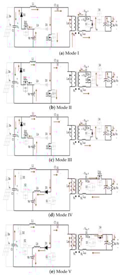 Operating diagram of each mode in Stage 2: (a) Mode I, (b) Mode II, (c) Mode III, (d) Mode IV, and (e) Mode V.