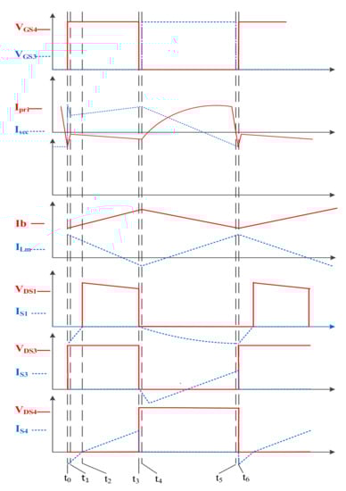 When t = t5, S1, S2, S3, and D2 remain OFF, while D1 remains ON. The direction of current flow in this mode is as shown in Figure 5f. Here, the parasitic diode on S4 is turned ON, which indicates that synchronous rectification is stopped. Other operations are the same as those in Mode V.