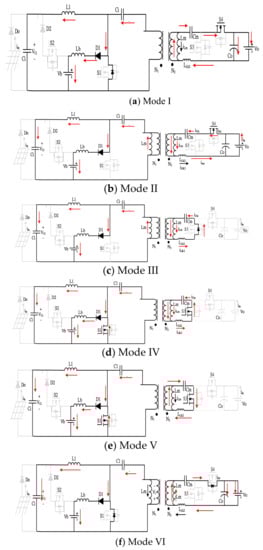 Operational diagram of each mode in Stage 1: (a) Mode I, (b) Mode II, (c) Mode III, (d) Mode IV, (e) Mode V, and (f) Mode VI.