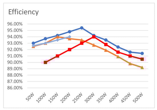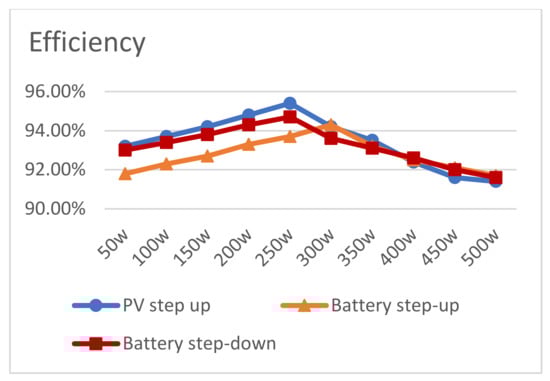 Figure 11 shows the measured efficiency curve of the proposed converter topology operated under three stages. The proposed converter operates under a light load of 50 W and full load of 500 W in the PV step-up stage, with efficiencies of 93.2% and 91.4%, respectively. However, when it operates at approximately 200 W, its highest efficiency reaches 95.4%. Next, for the battery step-up stage, its highest efficiency is 94.3%. Finally, for the step-down stage, the efficiencies for the abovementioned light and full loads are 92.3% and 91.6%, respectively. However, its highest efficiency reaches 94.3% when operated at 250 W.