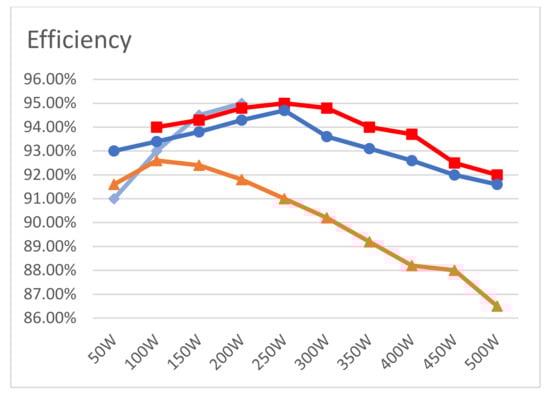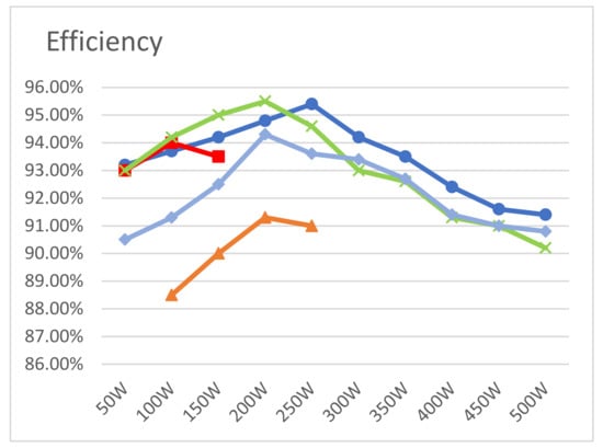 Figure 14 shows a comparison graph of efficiency between the proposed converter and those proposed in [,,,] when operated in the PV step-up stage. The proposed converter topology has an obvious superiority over the others.