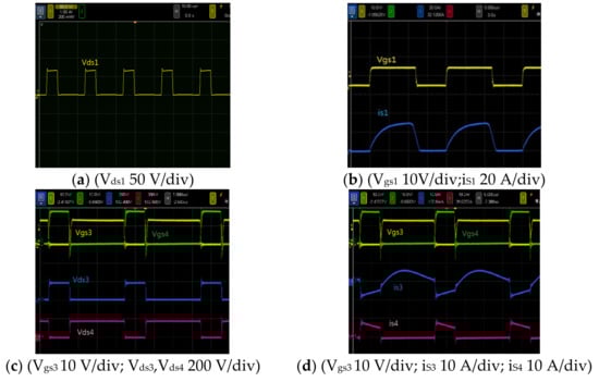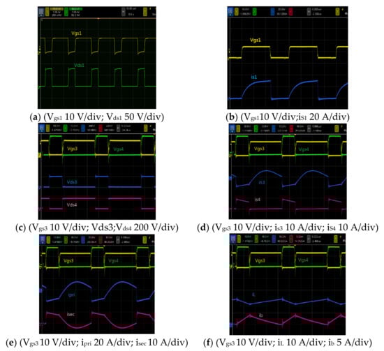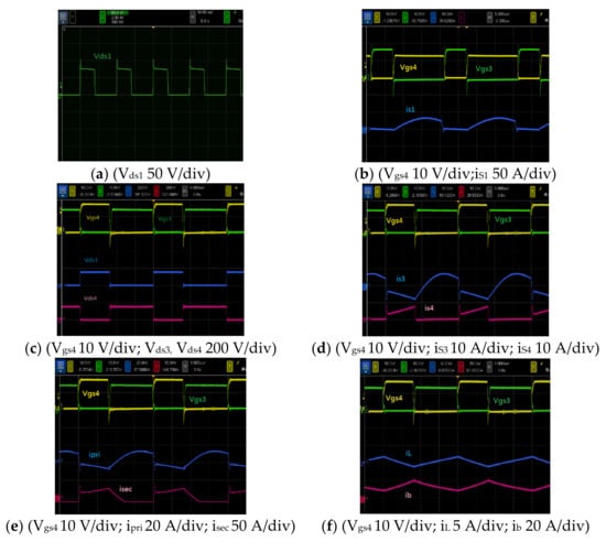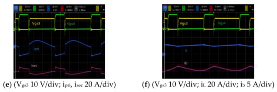 Figure 16 shows the measured results of the proposed converter under Stage 2. Figure 15a–d show the waveforms of the drive signal Vgs, switch voltage Vds, and switch current is of switches S1, S2, S3, and S4 under a full load of 500 W. Furthermore, Figure 15e,f show the current waveforms of transformers, ipri, isec, and inductors, iLb, iL1, under the full load, respectively.