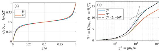 Profiles of mean streamwise velocity U and the mean temperature in (a) outer and (b) inner scaling. In panel (b), the grey chained lines indicate and for the mean velocity profile and for the mean temperature profile, and the black dashed line presents the profile of mean velocity obtained with an extremely large computational domain (96.0 h, 12.8 h) in Ref. [4].