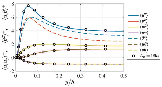 Profiles of (solid lines) the Reynolds stresses and (dashed lines) the temperature-related turbulent statistics and . The values are scaled based on the inner units, and/or , and only is shown. The black circles present profiles of the Reynolds stresses obtained with an extremely large computational domain (96 h, 12.8 h) in Ref. [4].