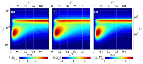 Spanwise one-dimensional premultiplied spectra of turbulent spatial fluxes of (a) streamwise turbulent energy , (b) temperature fluctuation , and (c) temperature-velocity correlation , presented in the same manner as in Figure 3. The values are scaled by , , and , respectively.