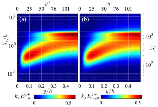 Spanwise one-dimensional spectra of (a) the Reynolds shear stress and (b) turbulent heat transfer , presented in the same manner as in Figure 3.
