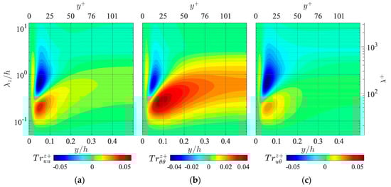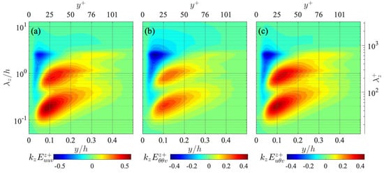 Next, the interscale fluxes of the temperature-related spectra are investigated. Figure 5 presents the distributions of the spanwise interscale flux of the streamwise turbulent energy , temperature fluctuation , and temperature-velocity correlation . Here, as can be seen from Equations (8) and (9), the positive values indicate forward energy fluxes (i.e., from larger to smaller scales) in the spanwise length-scale direction, whereas the negative values represent the inverse (from smaller to larger scales) energy fluxes. As shown in Figure 5a, the turbulent energy flux indicates mainly forward interscale energy transfers from larger to smaller in the relatively small range throughout the channel, but it also presents backward energy fluxes from smaller to larger in a relatively large range in the near-wall region. It is interesting to note that such inverse interscale energy transfer is not observed in the streamwise length-scale direction [4,7], and the corresponding physical phenomenon has still not been elucidated.