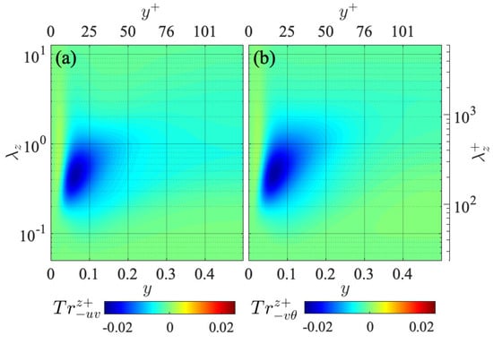 The interscale transfer of the turbulent heat flux gives a similar distribution to that of , as presented in Figure 6b. The difference between the distributions of these spanwise interscale fluxes is that spans to slightly larger spanwise wavelengths than . While it is still unclear what physical phenomenon is represented by such an inverse interscale transfer of and , the similar distributions of and indicate a close analogy between the transport of the Reynolds shear stress and turbulent heat flux.