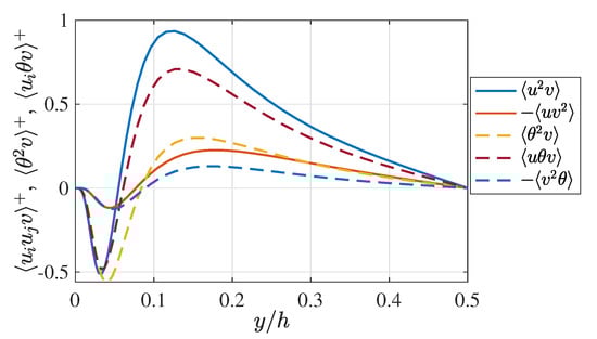 Figure 2 presents the profiles of the Reynolds stresses , , , and , and the temperature-related statistics: the temperature fluctuation and the velocity-temperature correlations and . As shown here, the temperature fluctuation and the streamwise-velocity-temperature correlation have similar profiles to the streamwise velocity fluctuation , which indicates a certain similarity between the fluctuations of the streamwise velocity u and of the temperature . This is attributable to the fact that the profiles of the mean streamwise velocity U and mean temperature are similar. It is also shown here that the profiles of the Reynolds shear stress and turbulent heat flux are almost on top of each other, which indicates a strong similarity between the turbulent momentum and the heat transfers. It should be noted that the cross correlations related to the spanwise velocity w, such as and , are negligibly small in magnitude compared to and , although the spanwise velocity variance is certainly larger than that of the wall-normal velocity , and these cross correlations related to w are, therefore, not investigated in the present study.