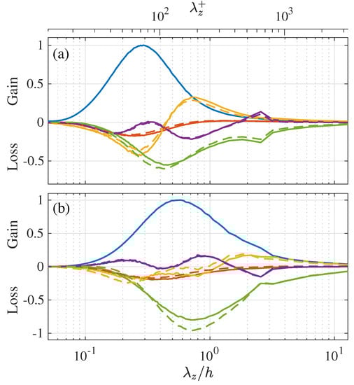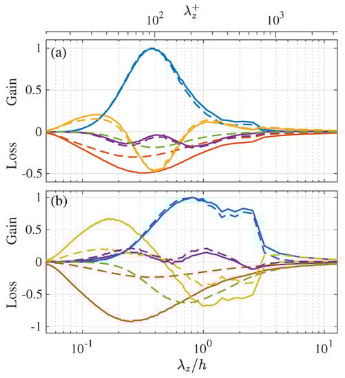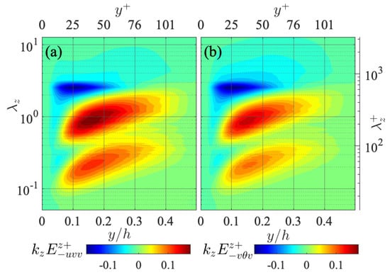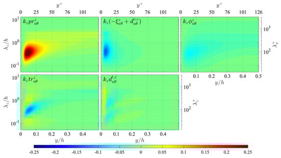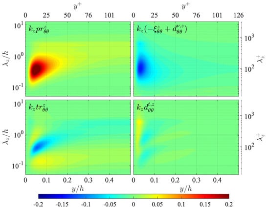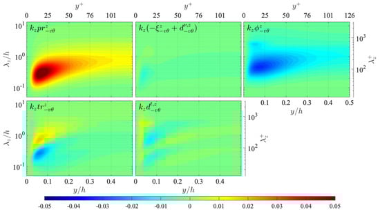 Here, the transport budgets of the Reynolds stress spectra are presented for comparison to those of the temperature-related spectra given in Figure 10, Figure 11, Figure 12, Figure 13 and Figure 14. The transport equations of the streamwise turbulent energy , wall-normal turbulent energy , and spanwise turbulent energy are, respectively, written as