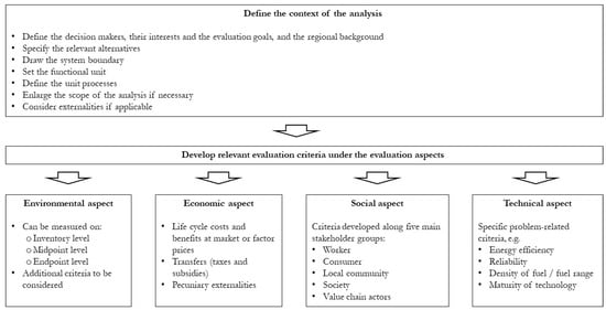 In this section, a new methodological framework for the selection of evaluation criteria for MCDA of RTFV alternatives is developed. The selection process is based on the notion of LCSA and combines MCDA and LCSA in a specific way that is consistent with the principles outlined in the literature review above. Instead of providing a predefined fixed pool of potential criteria from which the DMs can select their evaluation criteria, the methodological framework sets the frame within which criteria can be developed. Not all criteria typically included in LCSA have to be relevant for MCDA analyses. Instead, only criteria with significant differences between the alternatives add value to MCDA analyses, otherwise they have limited or no impact on the MCDA result. It may also be the case that the impacts along the entire life cycle—as is done in LCSA—do not have to be considered for all criteria. A useful method to identify irrelevant data is proposed by Wulf et al. [33].