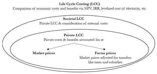 The economic criteria categories are based on the concept of LCC. LCC considers all economic costs and benefits over the entire product life cycle on a private or societal level [12]. Societal LCC [12,40] aims at monetizing all external costs like environmental or social costs. Conventional or private LCC considers private costs and benefits and is accounted for at market or factor prices. Factor prices are defined as market prices adjusted for transfers [40], i.e., redistributions between stakeholders like taxes and subsidies. The different levels of LCC analysis are summarized in Figure 2.