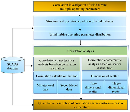 In the process of using SCADA state parameters to carry out research, it must involve the analysis of state parameter selection and its correlation. P. Sun et al. analyzed the typical operating parameters of wind turbines recorded in the SCADA system. These conditional parameters can be divided into two categories: Category 1 parameters include various component temperatures, output power, and rotor speed, which are greatly affected by environmental conditions. Type 2 parameters include pitch angle error, hydraulic oil pressure, and yaw angle error [23]. Y. Zhao et al. investigated 58 parameters collected in SCADA systems of wind turbines and divided these parameters into four categories: condition parameters, health parameters, performance parameters, and control parameters [24]. In addition to the clear physical relationship between some parameters in the wind turbine SCADA data, some parameters do not have a clear mutual physical mapping relationship. So far, the global correlation characteristics of operating parameters have not been established. Since the amount of SCADA data is vast, the relationship between parameters is complex, so it is necessary to further mine and analyze the correlation characteristics. To solve this issue, the distribution of operating parameters of wind turbines will be analyzed in the following sections. In Section 2, the structure and operation condition of wind turbines are introduced, which is the basis of the correlation investigation. In Section 3, the operating parameters of the wind turbine are classified and analyzed according to the energy flow characteristics. Then in Section 4, the correlation of operating parameters of the wind turbine is analyzed. A quantitative description of correlation characteristics is presented with a case on the temperature in Section 5, and the conclusions are given in Section 6. The overall research workflow chart is shown in Figure 1 and the key scientific contributions of this paper are as follows.