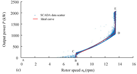 According to the curve characteristic of wind speed vs. power, the operation state of wind turbines can be divided into two regions: the region below rated power and the region above rated power [29]. Figure 2c shows the relationship between the rotor speed and output power. There is no effective functional expression to describe the relationship between the two. The operation state of wind turbines can be divided into four regions in Figure 2c. In region AB, where zero power output is the norm, wind turbines have yet to capture wind energy. Region BC is the start-up transition region. The relationship between the rotor speed and the output power is linear in this region. The corresponding rotor speed range in this region is small, and the power efficiency will rise to the maximum after the end of this region. In region CD, the rotor speed and power are designed to be non-linear to maintain maximum power efficiency, which is also the region with the most significant variation in rotor speed. Region DE is the transition region of wind energy from maximum capture to limited capture [30]. The rotor speed fluctuates in a small range during this region. The pitch system is activated and the aim is to limit the power of wind turbines to the rated value. That is to say, with the increase of wind speed, the rotating speed is unchanged, while the pitch angle becomes larger, which reduces the power efficiency.