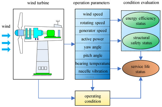 It can be seen that wind turbines will experience many kinds of working conditions in operation. How to evaluate whether a wind turbine is in the best working condition is an important problem to be solved in its operation and maintenance. Due to the coupling effect of aerodynamic, structure, and electric components, the condition evolution of wind turbines is the result of the comprehensive effect of many factors. Therefore, the condition (health) evaluation is a rather complex problem [31]. For example, with the increase of service time, the gradual deterioration of the aerodynamic performance of the blade, the demagnetization of the generator, the frictional wear and deformation of the mechanical structure, the change of the mechanical properties of the structural parts, the aging of electrical components, and the looseness of the connectors will cause the operating state to change. Large-scale wind turbines are generally equipped with the SCADA (Supervisory Control and Data Acquisition) system. The operating parameters are collected and stored through the SCADA system, and their performance can be mined from the SCADA data to evaluate energy efficiency, structural safety, and service life (Figure 3). With the extension of the service time of wind turbines, the data stored in the SCADA system is accumulated year by year, reflecting the current operating status of wind turbines and storing the historical service status. Therefore, fully mining the SCADA data information during the service of wind turbines is an important means to evaluate the status of wind turbines.