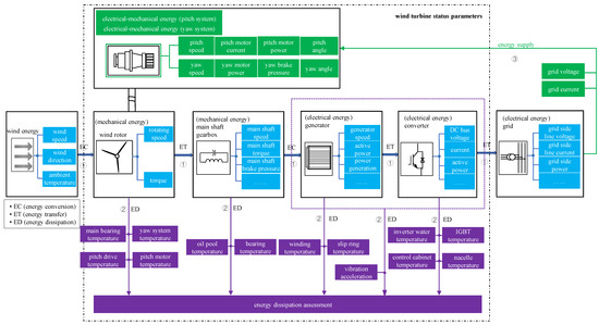 There are many kinds of operating parameters in the service of wind turbines. To investigate them better, they are classified and analyzed according to energy flow characteristics. In Figure 4, the energy flow is divided into three parts: (1) the main energy flow part, (2) the energy dissipation part, and (3) the energy supply part. First, the path through which wind energy is converted into mechanical energy and then into electrical energy, and then fed into the grid is defined as the main energy flow path. From energy capture, the electrical energy generated by wind turbines is essentially from wind energy (air kinetic energy). In SCADA systems, parameters related to wind energy such as wind speed, wind direction, and ambient temperature are generally collected. When the airflow flows through the wind rotor, it drives the wind rotor to rotate, and the kinetic energy of the air is converted into mechanical energy. The size of the mechanical energy is related to the rotating speed of the rotor and the generated mechanical torque. Due to mechanical inertia, part of the generated mechanical energy is stored on the wind rotor. Then, the mechanical energy is transmitted to the generator through the main drive system, and its basic form is that the wind rotor drives the generator rotor to rotate. If it is a direct-drive wind turbine, the rotating speed of the wind rotor, the rotating speed of the main shaft, and the rotating speed of the generator rotor are the same. If it is a doubly-fed wind turbine, the rotating speed of the wind rotor will be transmitted to the generator after increasing the speed. That is to say, the rotating speed of the generator rotor is much greater than the rotating speed of the wind rotor. The mechanical energy is converted into electrical energy at the generator through electromagnetic induction. Accordingly, the SCADA system will collect the state parameters such as generator speed, active power, and power generation in real-time. The connection mode between the generator and the grid will vary depending on the type of wind turbine. The stator winding is directly connected to the grid for the doubly-fed asynchronous wind turbines, and the rotor winding is connected to the grid through the converter. The frequency, voltage, amplitude, and phase of the rotor winding power supply are adjusted by the inverter according to the operation requirements, which ensures that the wind turbines can achieve constant frequency power generation at different speeds. Due to the AC excitation, the generator and power system are essentially “flexible connections”. The excitation current can be adjusted according to the grid voltage, current, and generator speed, thereby accurately adjusting the generator output current. For direct drive (semi-direct drive) wind turbines, the generator output end is connected to the machine side of the full power converter. The alternating current generated by the generator is rectified into direct current by the machine-side converter, and then inverted by the grid-side part of the converter into alternating current that meets the requirements of the grid, and is directly connected to the grid after boosting. For different wind turbines, the operating parameters of the converters collected by the SCADA system are different. Figure 4 shows a monitoring scheme for the operating state parameters of the wind turbine converter. The monitoring parameters include the DC bus voltage, current and active power of the converter.