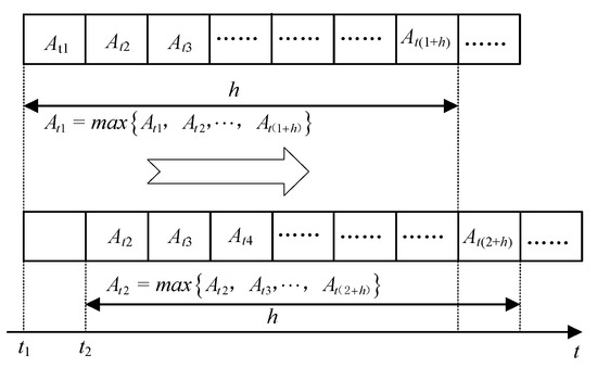 (2) The sliding window maximum (SWM) processing is performed on the nacelle vibration acceleration data. In SCADA data, the vibration acceleration of the nacelle has positive and negative values. This data characteristic makes it difficult to correlate with other parameters. It is better to use the SWM (Figure 5).