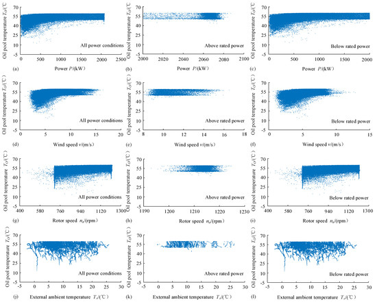 Temperature characteristics based on two-dimensional scatter. (a) Power vs. oil pool temperature in all power conditions; (b) Power vs. oil pool temperature above rated power; (c) Power vs. oil pool temperature below rated power; (d) Wind speed vs. oil pool temperature in all power conditions; (e) Wind speed vs. oil pool temperature above rated power; (f) Wind speed vs. oil pool temperature below rated power; (g) Rotor speed vs. oil pool temperature in all power conditions; (h) Rotor speed vs. oil pool temperature above rated power; (i) Rotor speed vs. oil pool temperature below rated power; (j) External ambient temperature vs. oil pool temperature in all power conditions; (k) External ambient temperature vs. oil pool temperature above rated power; (l) External ambient temperature vs. oil pool temperature below rated power.