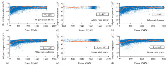 Oil pool temperature distribution at different ambient temperatures. (a) Power vs. oil pool temperature in all power conditions (Te > 10 °C); (b) Power vs. oil pool temperature above rated power (Te > 10 °C); (c) Power vs. oil pool temperature below rated power (Te > 10 °C); (d) Power vs. oil pool temperature in all power conditions (Te ≤ 10 °C); (e) Power vs. oil pool temperature above rated power (Te ≤ 10 °C); (f) Power vs. oil pool temperature below rated power (Te ≤ 10 °C).