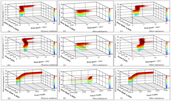 Temperature characteristics based on three-dimensional scatter. (a) Scatter relationship between wind speed, rotor speed, and oil pool temperature in all power conditions; (b) Scatter relationship between wind speed, rotor speed, and oil pool temperature above rated power; (c) Scatter relationship between wind speed, rotor speed, and oil pool temperature below rated power; (d) Scatter relationship between wind speed, power, and oil pool temperature in all power conditions; (e) Scatter relationship between wind speed, power, and oil pool temperature above rated power; (f) Scatter relationship between wind speed, power, and oil pool temperature below rated power; (g) Scatter relationship between power, rotor speed, and oil pool temperature in all power conditions; (h) Scatter relationship between power, rotor speed, and oil pool temperature above rated power; (i) Scatter relationship between power, rotor speed, and oil pool temperature below rated power.