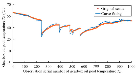 Figure 9 is a fitting curve obtained according to Equation (12). The abscissa in the figure is the observation number of the dependent variable (gearbox oil pool temperature), and the ordinate is the value of the dependent variable. The overall trend of the fitted curve is consistent with the original scatter. However, there will be some differences in the local data, especially in regions where the original temperature changes sharply. In general, the quantitative description equation of oil pool temperature obtained in this paper can better reflect the quantitative relationship between it and related variables and is also beneficial to the design and maintenance of wind turbines.