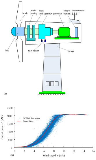 Wind turbines are complex electromechanical systems composed of blades, hub, transmission system, generator, tower, foundation, and other components, converting wind energy into mechanical energy and electrical energy [25,26]. There are three types of large-scale wind turbines: double-fed, direct-drive, and half-direct-drive. Figure 2a shows the typical structure of doubly-fed wind turbines which is selected to conduct the subsequent research. The parameters of the wind turbine are listed in Table 1. The low-speed rotation of the wind rotor (blade and hub) is converted into the high-speed rotation of the generator rotor through the speed-increasing gearbox. The rotating speed of the wind rotor is usually below 20 r/min, and the rotating speed is above 1000 r/min through the speed-increasing gearbox [27]. The structural advantage of doubly-fed wind turbines is that the generator can be smaller. However, the introduction of the speed-increasing gearbox increases the system’s failure rate. By comparison, the structural advantage of direct-drive wind turbines is that it omits the speed-increasing gearbox, and the rotating speed of the wind rotor is that of the generator rotor. As a result, the rotating speed of the generator is reduced, but it must be much larger than that of the doubly-fed generator under the same power condition. Half-direct-drive wind turbines can be considered a combination of the two, with the expected advantages.