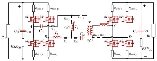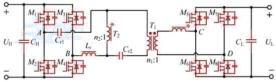 At present, many power electronics applications, such as renewable energy storage systems (RESSs), automobiles and microgrids, need bidirectional DC-DC converters (BDCs) to transmit power between two different DC buses [1,2,3,4,5,6,7,8]. Since galvanic isolation is an important security guarantee for many applications, isolated bidirectional DC-DC converters are widely used, which can be classified into two kinds: PWM converters and resonant converters [9]. Many PWM converters benefit from zero-voltage switching (ZVS) and a wide output voltage range [10,11,12,13,14,15]. Meanwhile, power can be transmitted naturally between the two sides [16,17,18]. However, as zero-current switching (ZCS) cannot be realized easily in many PWM converters, the switching loss cannot be further reduced. By means of resonance between inductors and capacitors, the AC currents in resonant BDCs present as sinusoidal waveforms. Therefore, ZCS can be realized by reasonable design, and efficiency can be further increased. A large number of resonant BDCs with a wide voltage range have been studied recently [19,20,21,22,23,24].