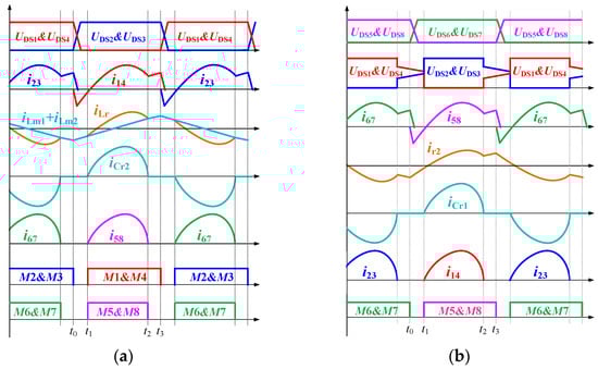In order to simplify the analysis, the operation waveforms of currents, voltages and gate signals are depicted in Figure 2. In Figure 2, i14 is the drain-source current flowing through M1 and M4, i23 is the drain-source current flowing through M2 and M3, i58 is the drain-source current flowing through M5 and M8, and i67 is the drain-source current flowing through M6 and M7. iLm1 is the excitation current of transformer T1 on the HVS, iLm2 is the excitation current of transformer T2 on the HVS, iLr is the current flowing through resonant inductor Lr, i’Lm1 is the excitation current of transformer T1 on the LVS, i’Lm2 is the excitation current of transformer T2 on the LVS, iCr1 is the current flowing through resonant capacitor Cr1, and iCr2 is the current flowing through resonant capacitor Cr2. UDS14 is the drain-source voltage of M1 and M4, UDS23 is the drain-source voltage of M2 and M3, UDS58 is the drain-source voltage of M5 and M8, and UDS67 is the drain-source voltage of M6 and M7. M1 and M4 are the driving signals of M1 and M4, M2 and M3 are the driving signals of M2 and M3, M5 and M8 are the driving signals of M5 and M8, and M6 and M7 are the driving signals of M6 and M7.