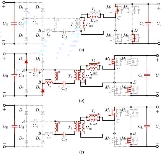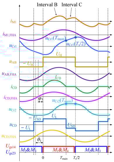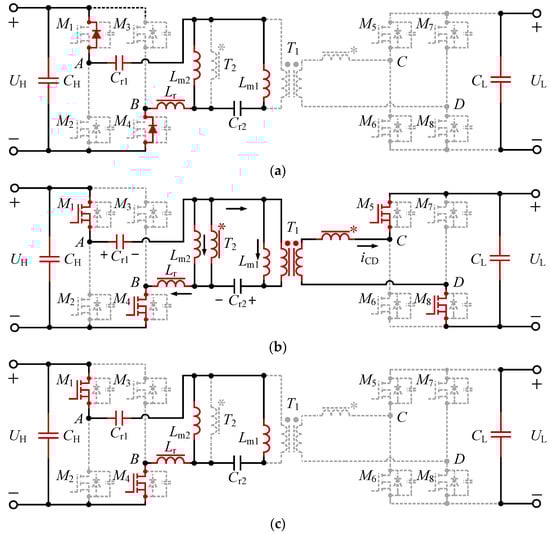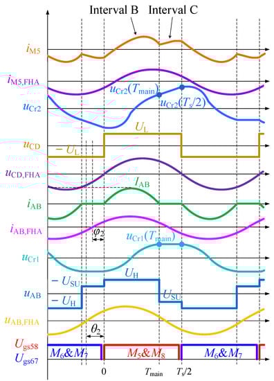 Interval B [t1–t2]: At t1, M1, M4, M5 and M8 turn on, and power is transmitted from the HVS to the LVS. The resonant current changes in a sine wave with main resonant frequency fr. At t2, iLr is equal to the sum of iLm1, and iLm2, iCr2 and i58 become zero. The directions of the state variables are shown in Figure 3b. The relevant expressions in Interval B are listed below:.