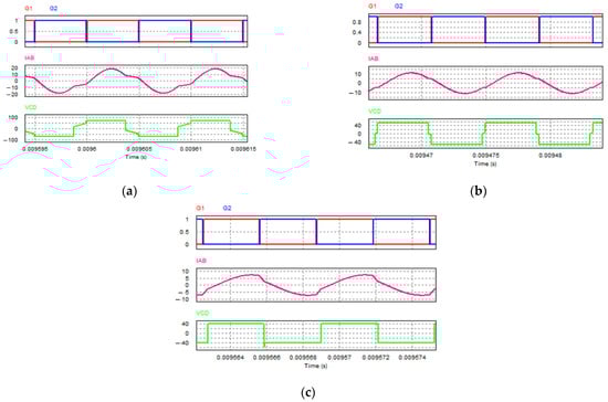 Simulation waveforms in step-down mode, 400 V, 1 Ω: (a) 90 kHz; (b) 120 kHz; (c) 160 kHz.
