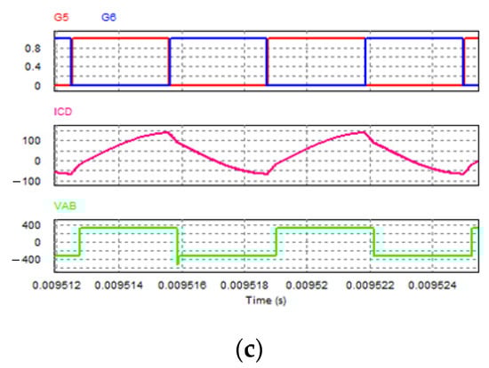 A simulation in PSIM software is used to verify the analysis. In PSIM, idealized components are used to build circuits, and the trapezoidal method is adopted to solve system equations. In this way, the simulation velocity is increased, and the robustness of the simulation is improved. Figure 5 shows the simulation model of the DHC-LT BDC. Rmos_H, Rmos_L, RCr1, RCr2, RLr, RT1_H, RT2_H, RT1_L, RT2_L, ESRCH and ESRCL are the resistances of the components. In Figure 6a,b and Figure 7a,b, the waveforms in two directions are shown, proving that secondary resonance exists in DCM mode. The output voltages VCD and VAB are not clamped to UL and UH when secondary resonance appears. On the contrary, in Figure 6c and Figure 7c, when the switching frequency increases beyond the main resonant frequency, the resonant currents in the tank, iAB and iCD, are continuous. VCD and VAB are clamped to UL and UH in the half period.