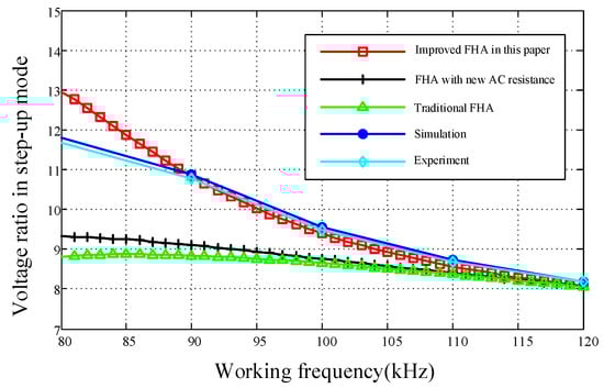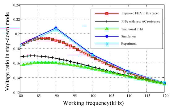 In order to prove the effectiveness of the improved FHA method proposed in this paper, the methods of the experiment, the improved FHA in this paper, traditional FHA, FHA with an improved model of the AC port equivalent resistance in [36] and simulation are used simultaneously. The simulation results almost coincide with the experimental results, which means that the simulation model is effective. The parameters of the experimental prototype are listed in Section 5. In Figure 13 and Figure 14, the errors between the experimental results and other methods are minimum around the main resonant frequency. The reason is that, when the DHC-LT converter is working around the main resonant frequency, resonant voltages and resonant currents in the tank are sinusoidal waveforms, and nearly no distortion exists. As the working frequency is reduced, the methods of traditional FHA and FHA with the improved model of the AC port equivalent resistance have a major error. However, when the phase angle of the AC load is considered, in Figure 13, from 80 kHz to 120 kHz, the biggest error between the improved FHA in this paper and the experimental results is around 9%, less than the other methods. Similarly, in Figure 14, from 80 kHz to 120 kHz, the biggest error between the improved FHA in this paper and the experimental results is around 10%. The working frequencies under the peak voltage gain in the improved FHA and experiments are almost the same. The theoretical work is verified by experiments and found to be in good agreement. Therefore, the improved FHA method in Section 3 of this paper is effective in describing the gain characteristics of the DHC-LT converter.