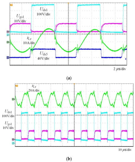 Figure 15 shows the experimental results of the prototype converter. In Figure 15, Ugs1 is the drive signal of M1, Uds1 is the D-S voltage of M1, Ugs5 is the drive signal of M5, Uds5 is the D-S voltage of M5 and iLr is the current of the resonant inductor.
