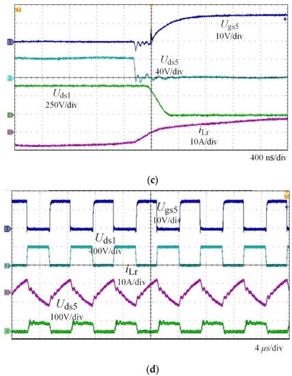 Figure 15c,d shows the experimental results in step-up mode. In Figure 15c, ZVS is realized. Uds5 decreases to 0, before Ugs5 comes. The dead time of 300 ns in this prototype is wide enough for both the HVS and LVS power switches, while the efficiency is not affected. In Figure 15d, as the working frequency is higher than the main resonant frequency, secondary resonance does not exist, which is consistent with Section 2.2.2.