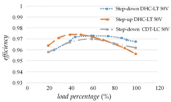 The efficiency curves of the DHC-LT converter are shown in Figure 16, which were obtained by experiments. In step-down mode, the peak efficiency is 97.3% when the LVS voltage is 50 V, while the efficiency with 100% load is 96.8%. In step-up mode, the peak efficiency is 97.4% when the LVS voltage is 50 V, while the efficiency with 100% load is 95.7%. The resonant capacitor Cr2 is moved from the LVS to the HVS, and the heat it produces decreases. As a result, it can be seen that the efficiency of the 2.5 kW DHC-LT converter is higher than that of the 2.5 kW CDT-LC in step-down mode [29]. The advantage of DHC-LT is shown through comparison.