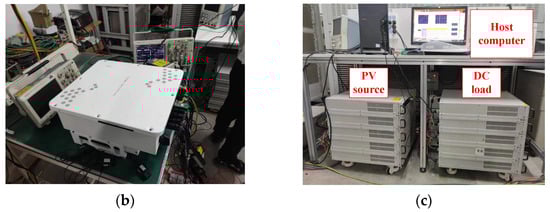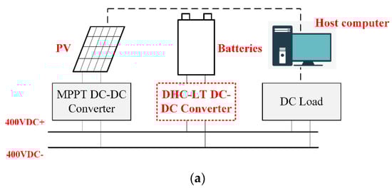 To verify the proposed DHC-LT converter in a battery/PV system, the battery/PV test system diagram is shown in Figure 19. In Figure 19a, the maximum power point tracking (MPPT) DC-DC converter and the DHC-LT bidirectional DC-DC converter transfer the energy from the PV and batteries to the 400 V DC bus. The power PV generated is stored in batteries and expended in the DC load. When the DC load is heavier than the power PV generated, the batteries start to release power to the DC bus and the DC load. Figure 19b shows the prototype of the DC power system, which consists of the MPPT DC-DC converter, the DHC-LT DC-DC converter and their control system. In Figure 19c, one DC source is used to simulate PV, while the other electronic load is used as the DC load on the 400 V bus. They are both controlled by the host computer on the desk.