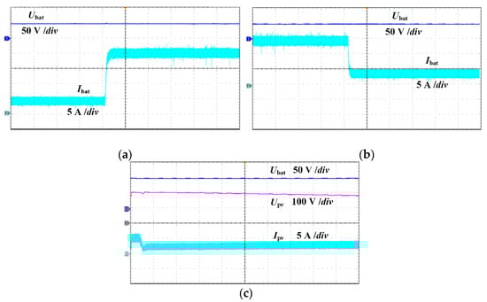 Waveforms in the battery/PV test system are shown in Figure 20. Figure 20a,b shows the variation of battery voltage Ubat and battery current Iba, when the DC load changes. Ubat changes little because the battery voltage is mainly determined by the ideal voltage source inside. Figure 20c shows the waveforms, and when the illumination intensity decreases, the PV current Ipv decreases as a result. Then, the MPPT arithmetic works, Ipv increases and PV voltage Upv decreases to reach the new maximum power point.