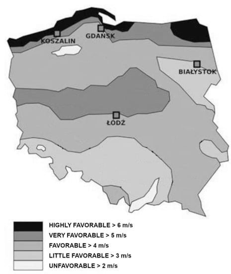 - It was demonstrated that energy productivity in a built-up area (Koszalin) located in a zone with very favorable wind conditions may be comparable to that in a zone with little favorable wind conditions (Białystok).