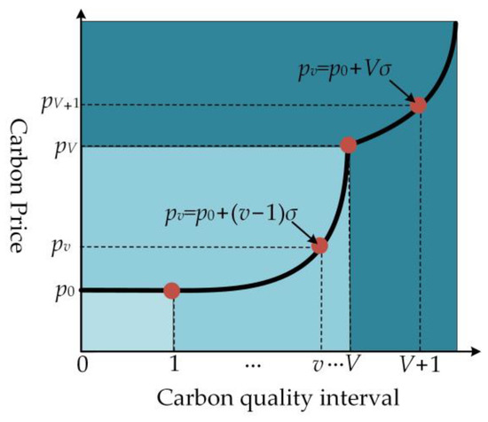 Objective function of the ith MG includes four terms referred to as the cost of trading power from the utility grid, cost of natural gas combustion, maintenance cost of discharge/charge power with ES and HS, and cost of carbon trading. The tiered carbon emission price in the interval is shown in Figure 2. Note that the carbon price in the 0th and 1st interval is p0, whereas the actual carbon emission is less than the quota quality. The carbon price is related to both the vth interval and the increment σ in the interval 1 ≤ v ≤ V, and the carbon quota is less than the actual emission. When the carbon emission exceeds the Vth interval, the carbon price is only related to the increment σ. There is the index for time, which is used for hourly dispatch. The constraints, which are related to each unit of the MG, are as follows: