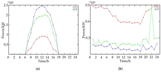 In this section, simulations in a test system are done to demonstrate the changes of the MC optimum energy management using the proposed hybrid game model. The system architecture of the calculation example is shown in Figure 1, and the specific dispatching model of each MG is shown in Appendix B. For the specific parameters of each unit of MGs1–3, refer to Appendices Table A1 and Table A2. The power of RE in MC is shown in Figure 5. The Solver CPLEX in the MATLA2020a environment is employed to perform the energy management.