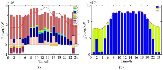 The low power output of RE in MG2 needs to rely on GT and other MGs to provide electrical power. It can be seen from Figure 7a that the electrical load is relatively low; however, the heat load demand is large, resulting in a relatively high power production of GT, and the surplus electrical power is sold to other MGs. The GT provides a considerable amount of thermal power to meet the load in a day cycle in Figure 7b, and the HS mainly meets the thermal power balance characteristics in the whole system.