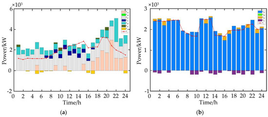 As seen from Figure 6a, the electrical load level is relatively low at 1:00–5:00 and 17:00–24:00, and the wind power of MG1 is sufficient to sell electrical power to other MGs. The electrical load reaches the peak from 6:00–16:00; the CHP works at full power. MG1 is buying electrical power from SP and other MGs at the same time. As for the heat load in Figure 6b, the electrical power generated by CHP is relatively low during 1:00–4:00, so the heat power is also too low to meet the heat load demand. At the same time, the heat generated by the HP is sufficient to meet its own heat load demand. Due to working at full power for CHP at 8:00–22:00, the heat power production is sufficient for the heat load.