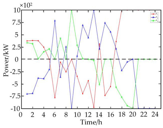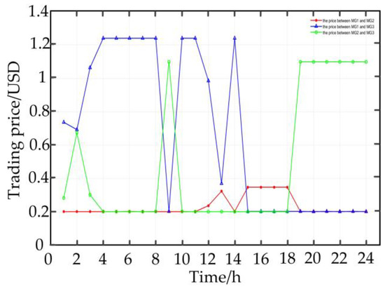 MG2 sells electricity to MG3 in Figure 9 from 9:00–15:00, for which the transaction price between MG2 and MG3 is relatively high at this time, as shown in Figure 14; MG2 purchases electric power from MG3 at 4:00–8:00, and the price between the two is at a low level. It can be seen that the transaction price among the MGs changes with the change in the electric power transaction.