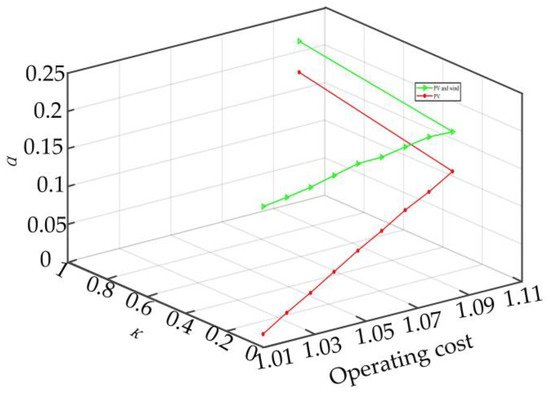 Equation (46) refers to the maximum radius of uncertainty; κ is the robustness level factor, and the greater its value, the greater the degree of risk avoidance and the stronger the robustness of the dispatching scheme. It can be seen that the above IGDT robust dispatch model belongs to a two-layer optimization model. The lower layer represents that when the PV and wind output fluctuates in the uncertain set, the operating cost of the system cannot exceed the expected cost value. In order to improve the solving efficiency, Equation (46) is simplified into a single-layer optimization model, as shown in Equation (47).
