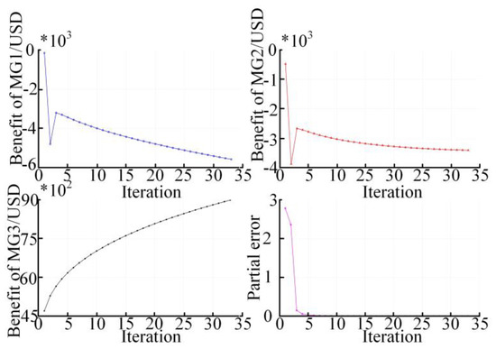 Figure 13 shows the transaction benefits among MGs and the results of the residual error iterative convergence. The ADMM algorithm requires 33 iterations to achieve convergence, the time is 53 s, and the convergence residual error is 10−3. Therefore, it shows that the ADMM algorithm proposed in this paper has good convergence performance and computational efficiency.