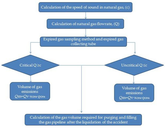 Algorithm for calculating the volume of emergency gas emissions where Qm is the mass rate, expressed in (kg) per time unit; Qv is the volumetric rate, expressed in (m3) per time unit; xCH4 is the methane share in the natural gas composition (in %), typical for a particular gas system, subject to reporting; CH4 is the density of methane (i.e., 0.715 kg/m3 in normal conditions; i.e., at 0 °C and 1 bar).